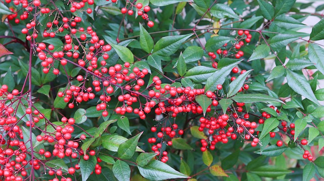 빨간 남천 열매의 무리는 잘 익은 산초 열매처럼 보이기도 한다. 하지만 먹을 수 있는 산초 열매와는 달리 남천 열매는 먹을 수 없다.